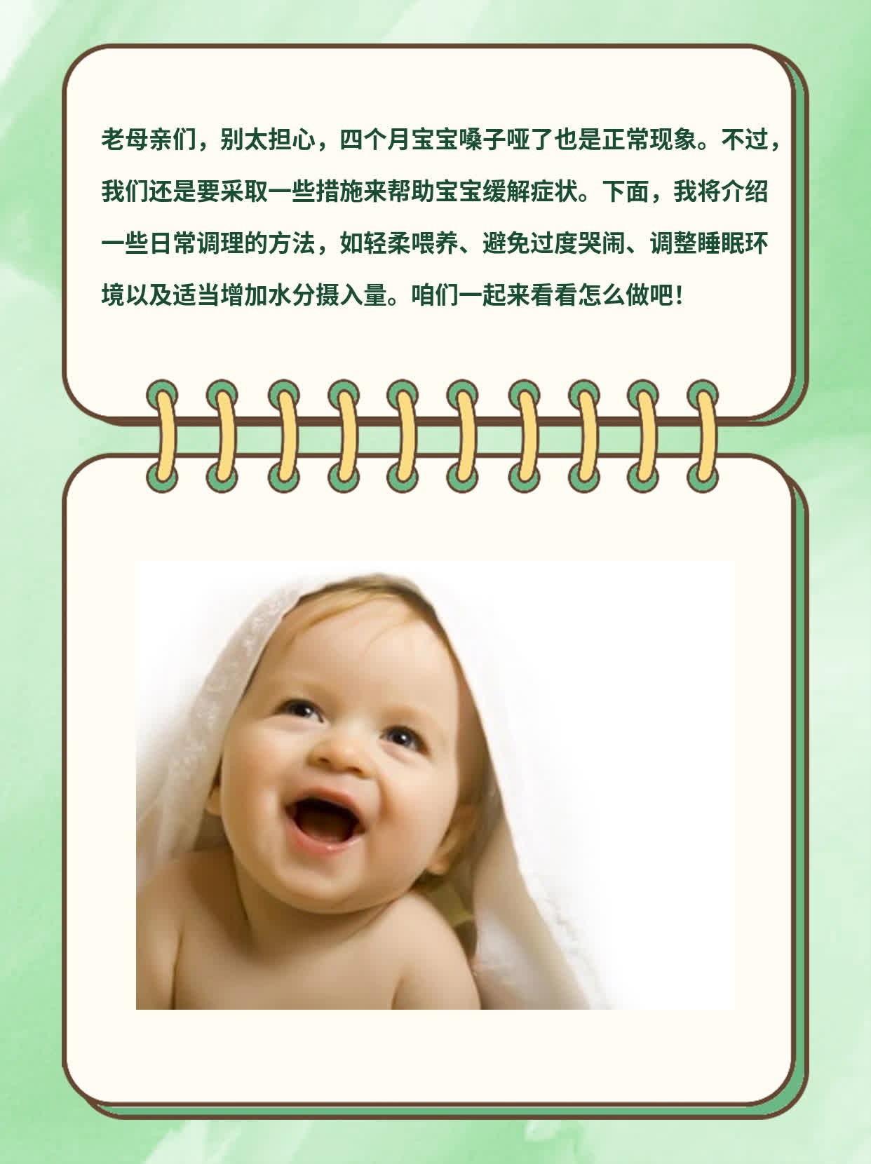 2024-05-24最近我身边的朋友小曾遇到了一些麻烦。她的宝宝突然间嗓音变得沙哑,这让她感到非常担心。小曾说她一开始并没有太在意,以为是宝宝在学说话时的正常现象。但是随着日子一天天过去,宝宝的嗓音不仅没有变好,反而越来