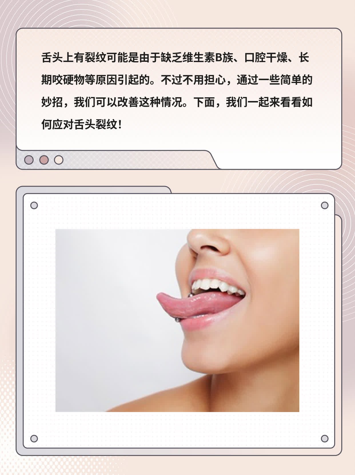 2024-05-27我有个朋友叫小赵,他最近发现自己的舌头上有几道裂纹,开始还以为是咬到或者不小心刮伤了,结果过了几天还没好。于是他就开始担心是不是有什么大问题。