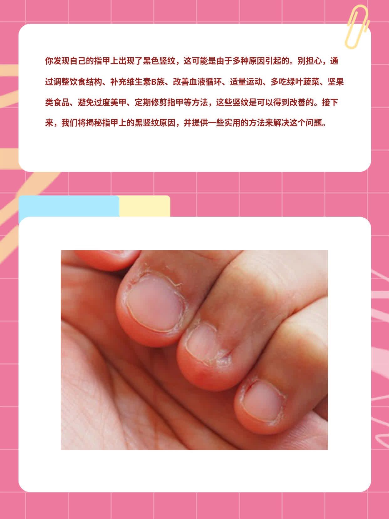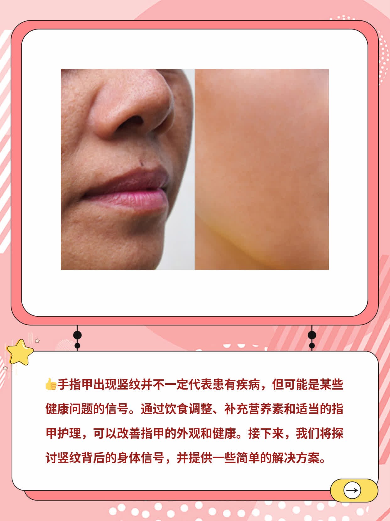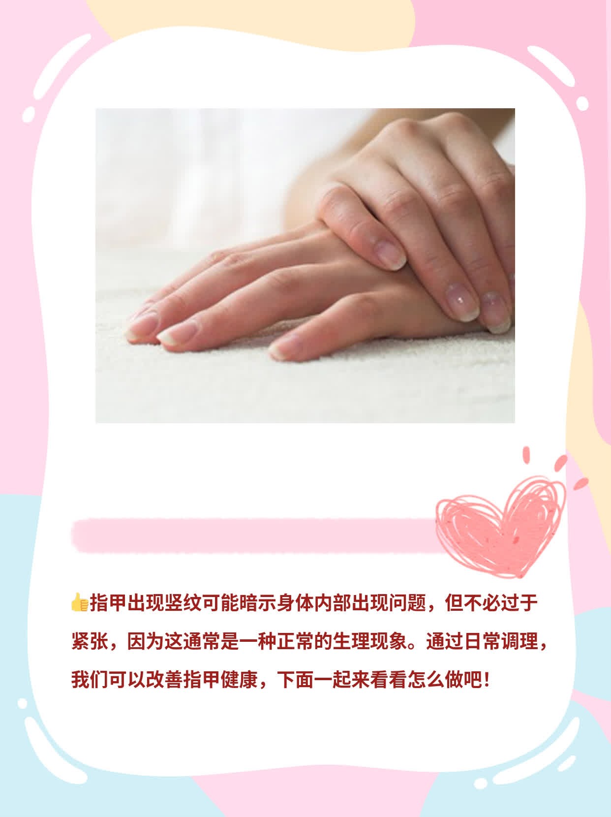 2024-05-27这回我要跟大家聊一聊指甲上的那些事儿。我有个朋友叫小杜,她最近发现自己的指甲上出现了一些竖纹,一开始没太在意,后来这些竖纹越来越多,她开始担心是不是身体出了什么问题。