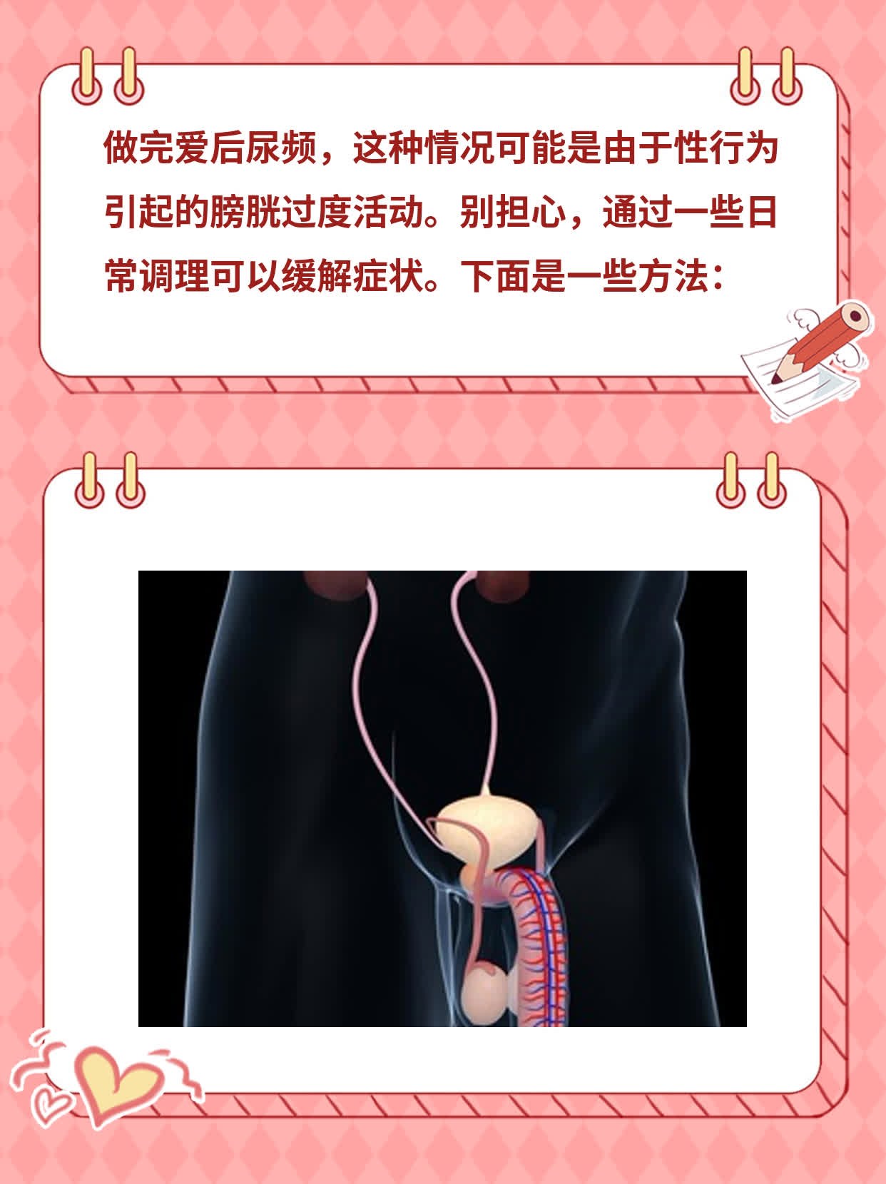 最近我身边的朋友小郭跟我吐槽说他做完爱之后总是想上厕所,尿频得厉害。一开始他还以为是身体自然反应,没太在意,后来情况越来越严重,这才开始担心起来。