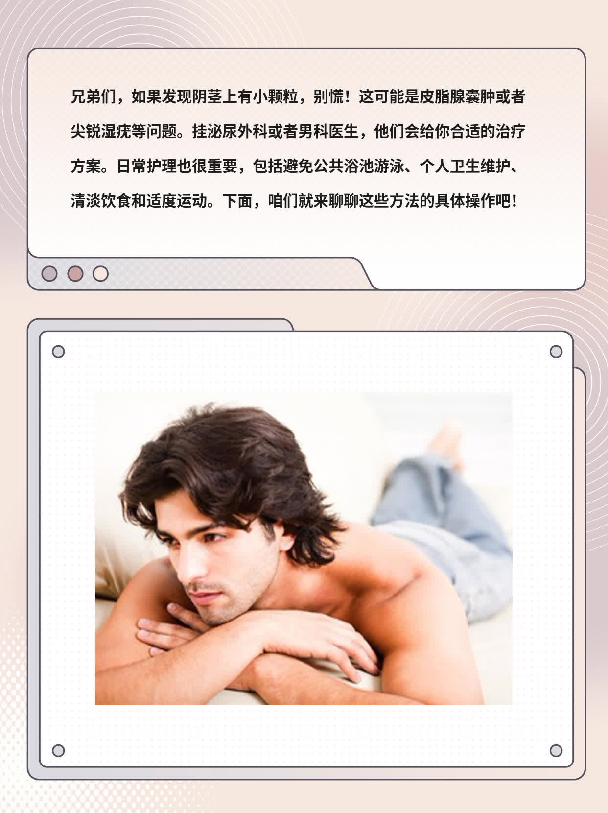 我有个哥们儿叫小丁,他那玩意儿上头长了些小颗粒,开始还以为是啥脏东西,结果越长越大,这可愁坏了他。小丁平时爱运动,喜欢泡澡堂子。自从发现这个情况之后,他就再也不去公共浴池洗澡了,生怕被人看见。有时候晚
