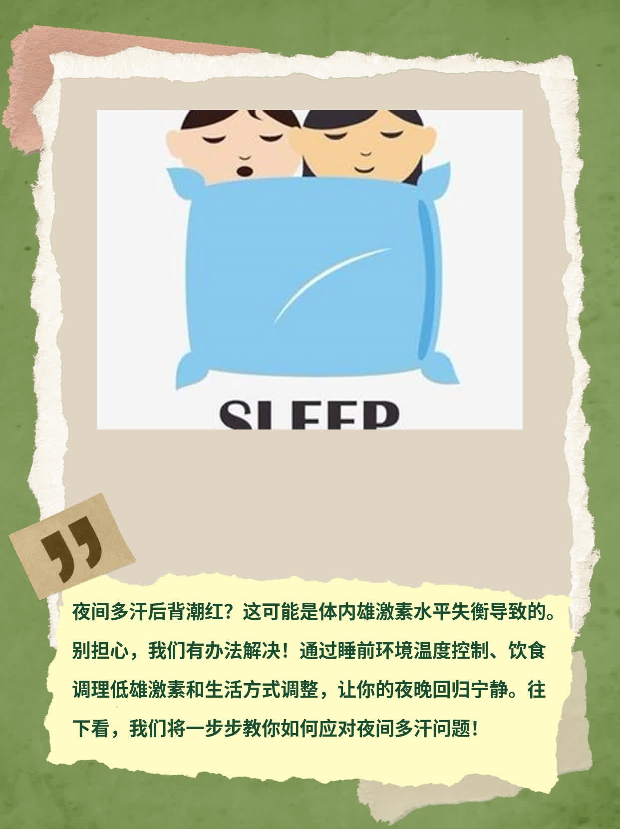 你知道吗?有些男人晚上睡觉的时候会出好多汗。我有个朋友叫小谢,他就是这样的情况。起初,小谢以为是天气太热或者被子盖得太厚导致出汗,但后来发现并不是这样。他开始感到非常困扰,因为每晚都会被汗水湿透床单,