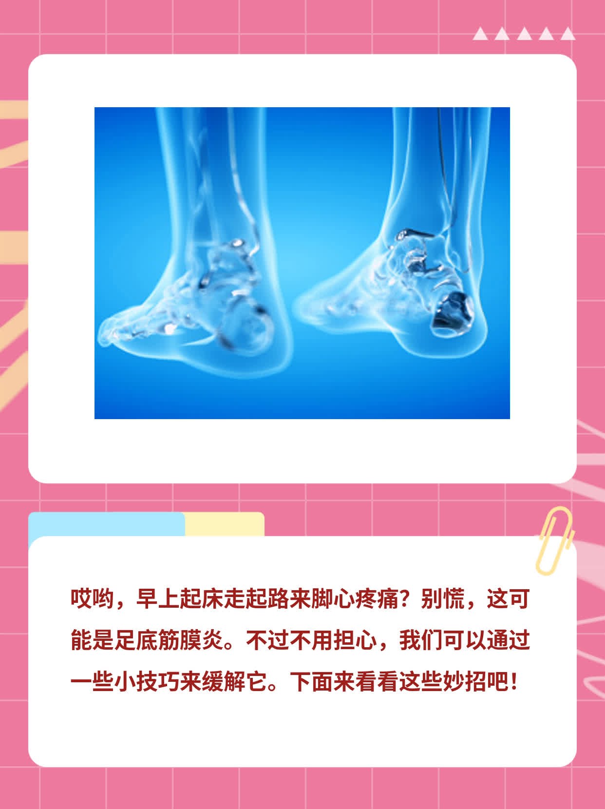 这回咱来聊聊我那好兄弟小蒋啊。他最近有点儿闹心,每天早上起床走两步就感觉脚掌心疼得不行。一开始他还以为是前一天运动量太大导致的肌肉酸痛,可休息了一天也没见好。这种疼痛感从足底一直蔓延到小腿,严重影响了