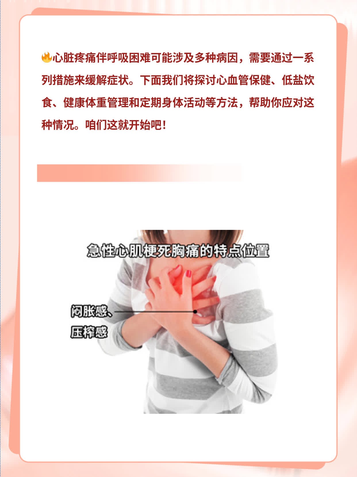 最近我身边的朋友小张开始出现心脏疼痛伴呼吸困难的症状。一开始他以为是工作压力大引起的,但症状持续了一段时间,让他感到非常困扰。
